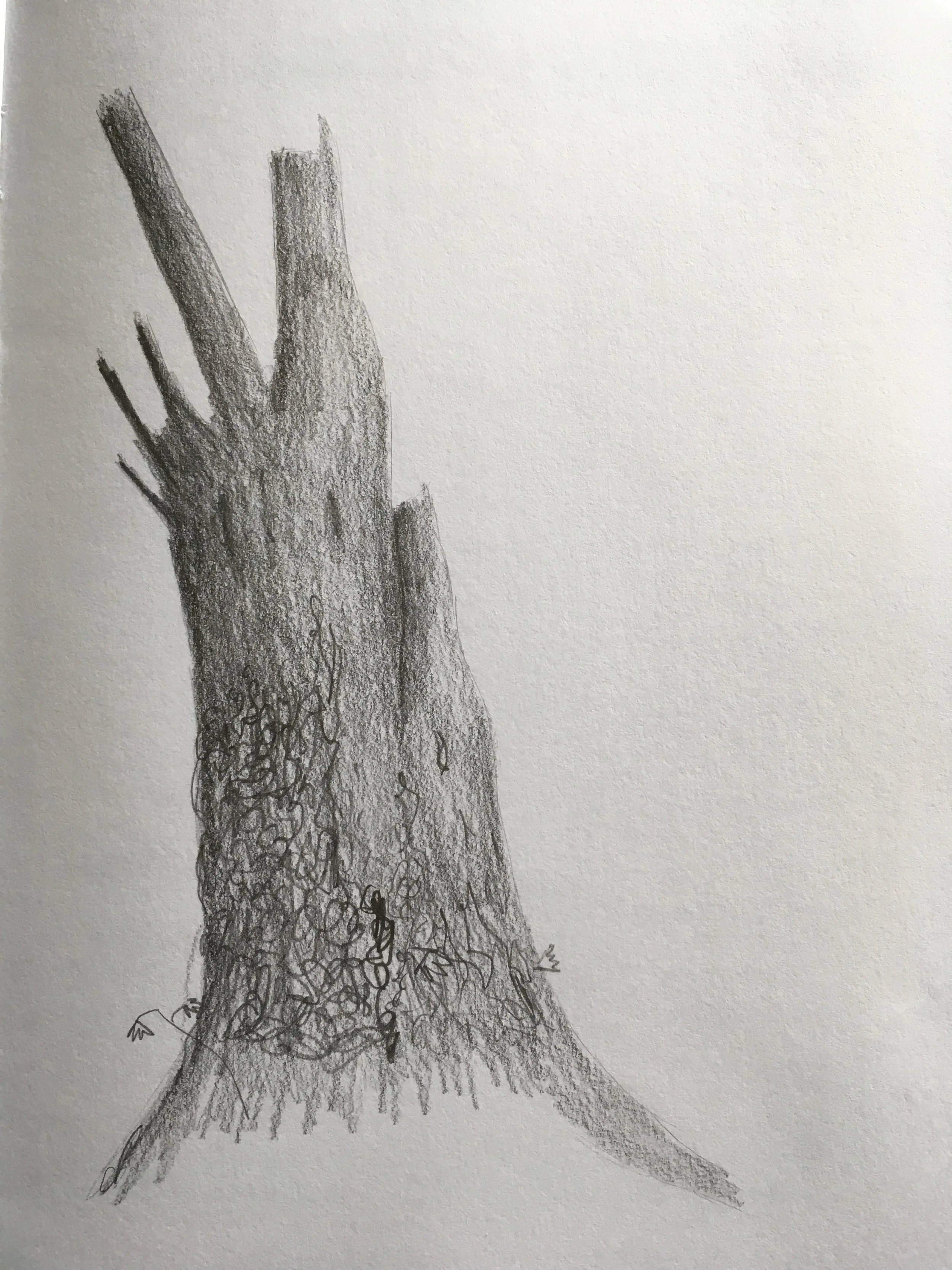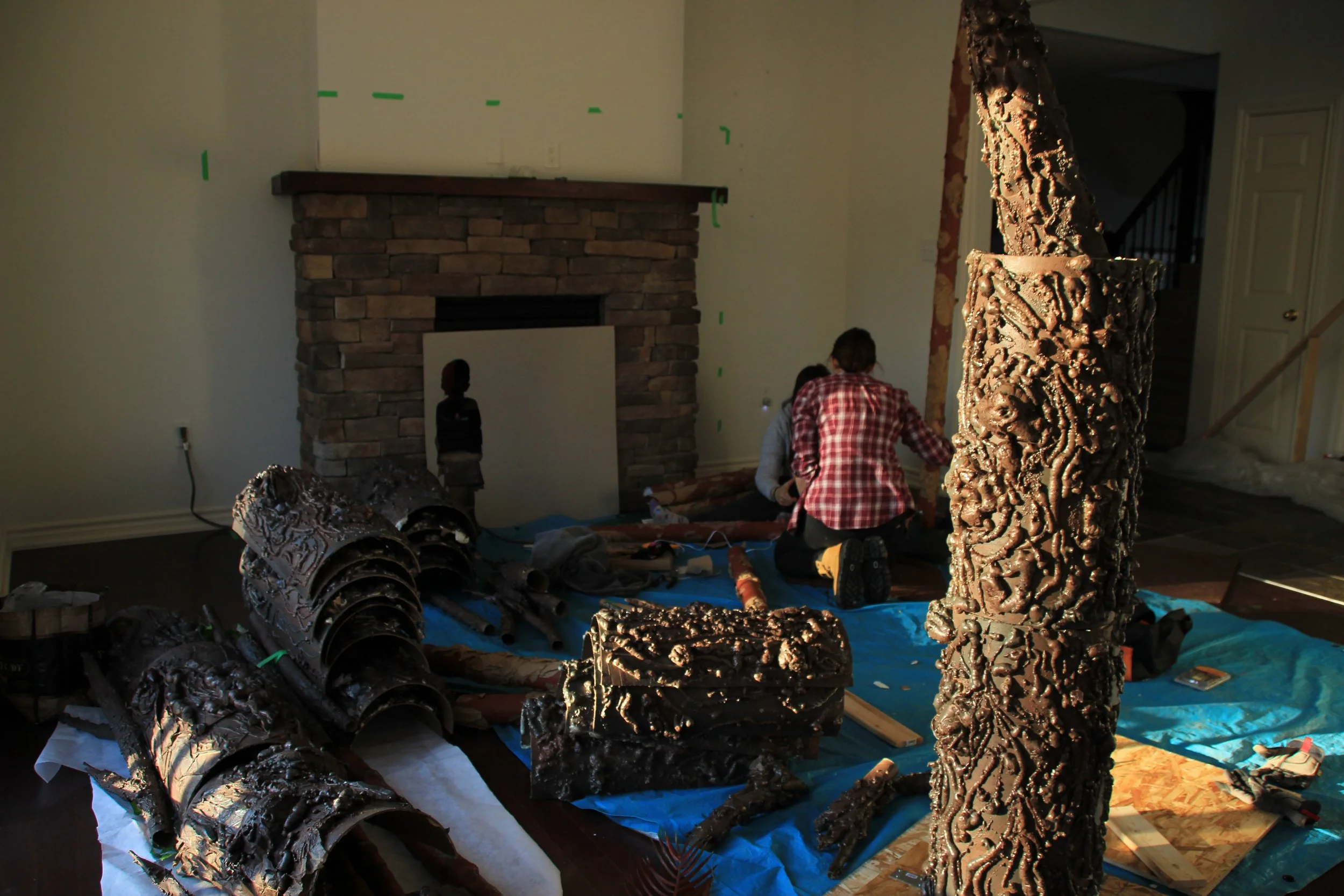 Creation of the trees using sono tubes, spray foam, tree branches, and cardboard. Finishing touches were created with paint, faux ivy, and moss (both real and synthetic).