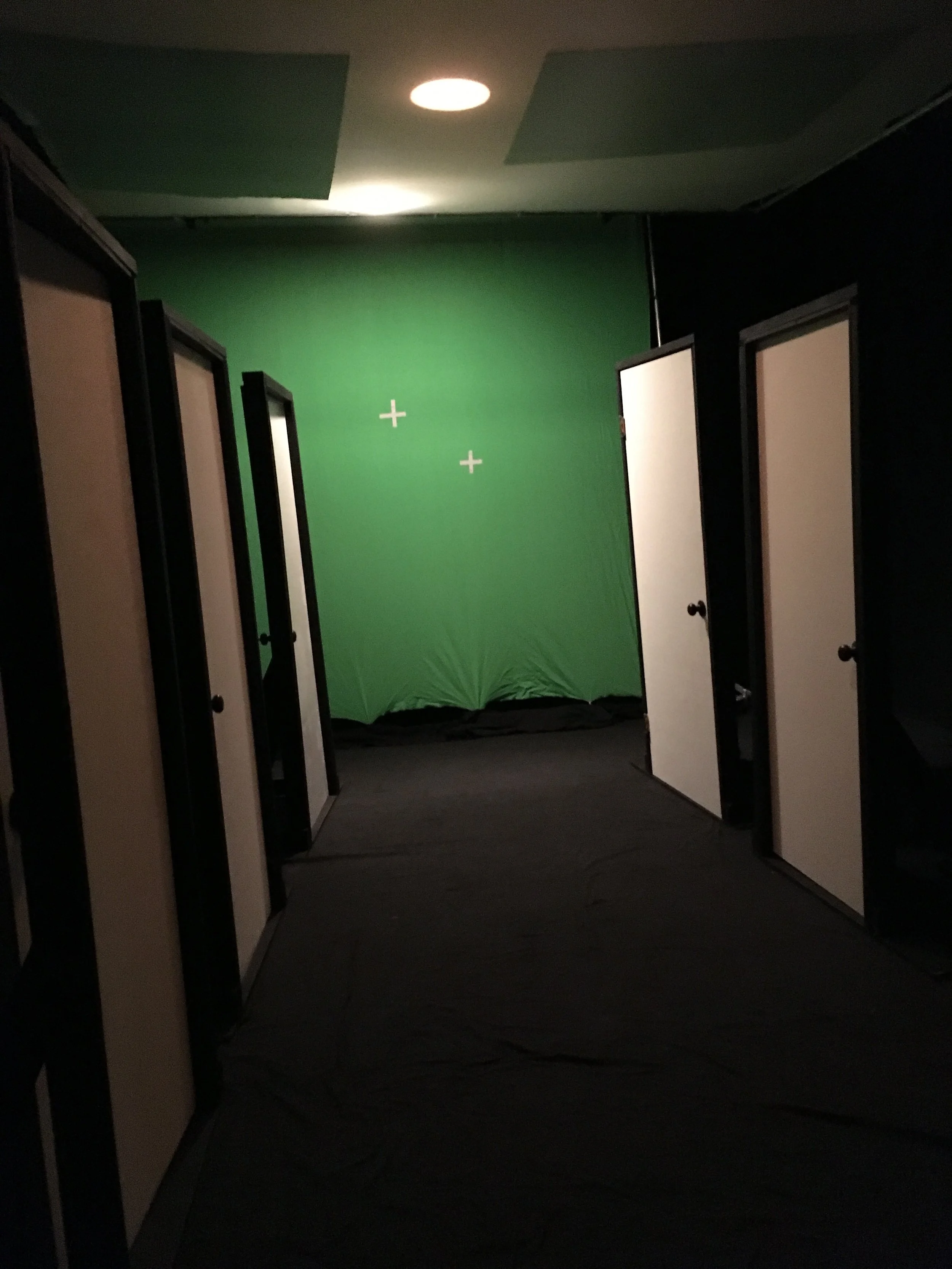Construction sketch, fabrication mock-up, and filming set up for the hallway of doors. Six freestanding doors were constructed with the others added with VFX.